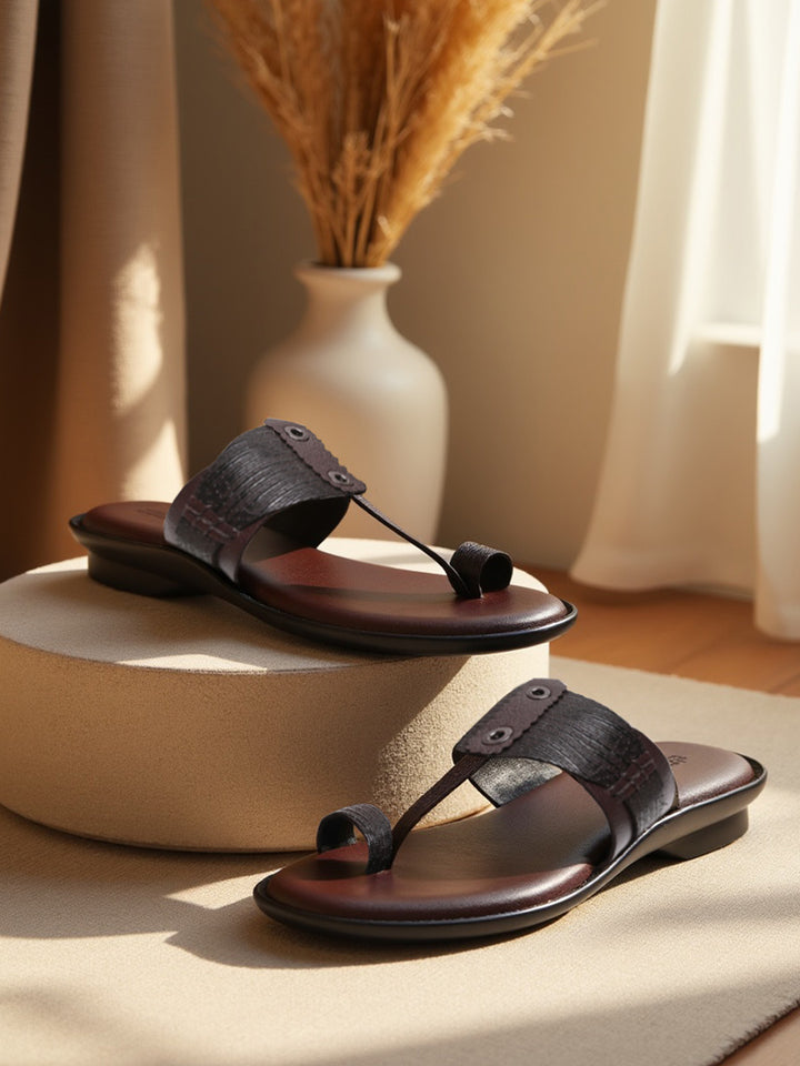 The Regal Men's Leather Casual Kolhapuris bring a contemporary twist to a timeless classic. Crafted from premium leather, these Kolhapuris combine traditional Indian craftsmanship with modern comfort, making them ideal for casual outings or festive occasions. Their sturdy build and breathable design ensure all-day comfort, while the versatile style pairs effortlessly with ethnic wear, jeans, or summer attire. Add a touch of heritage to your wardrobe with these elegant and durable Kolhapuris.