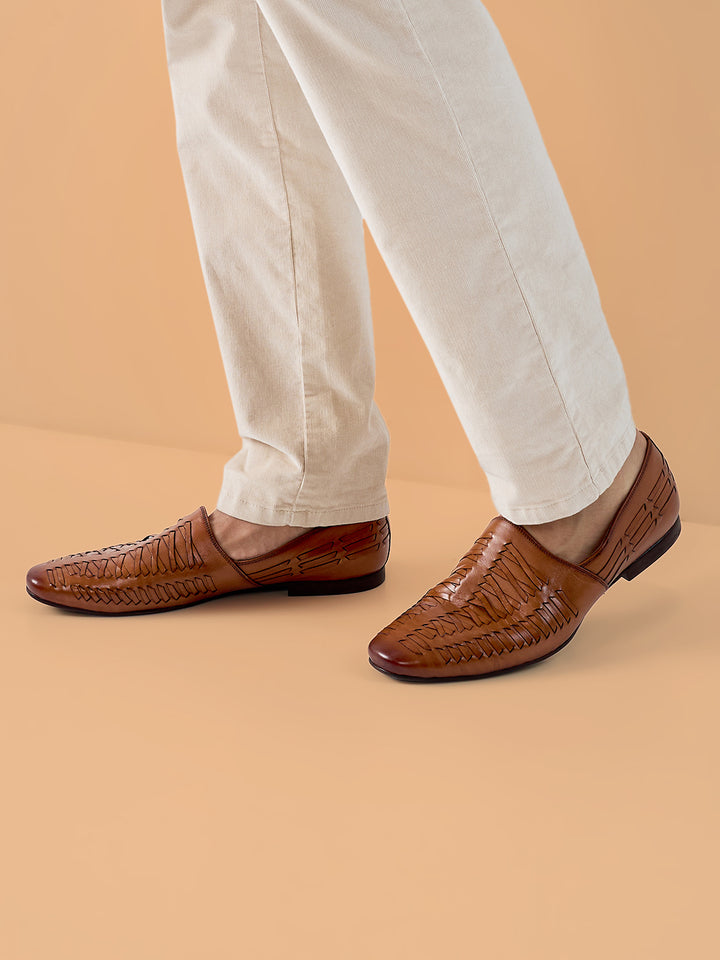 Crafted with a detailed woven leather design, these slip-ons bring a refined ethnic flair to every celebration. The lightweight TPR sole keeps you steady and comfortable through long festive hours, from weddings to family gatherings. Easy slip-on styling and a soft comfort insole make them a go-to pick for party-ready elegance all year round.