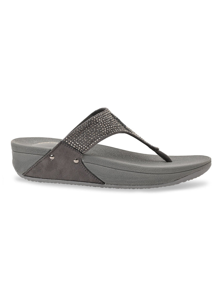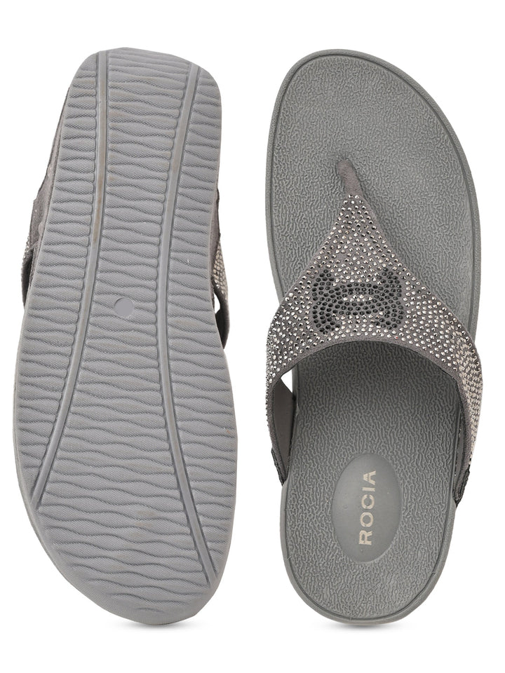 Shine all day in Rocia by Regal Grey Women Diamond Studded Comfort Wedges. These 2-inch synthetic wedge heels have TPR soles, slip-on closure, open round toes, and T-strap detailing, suited for casual summer elegance.