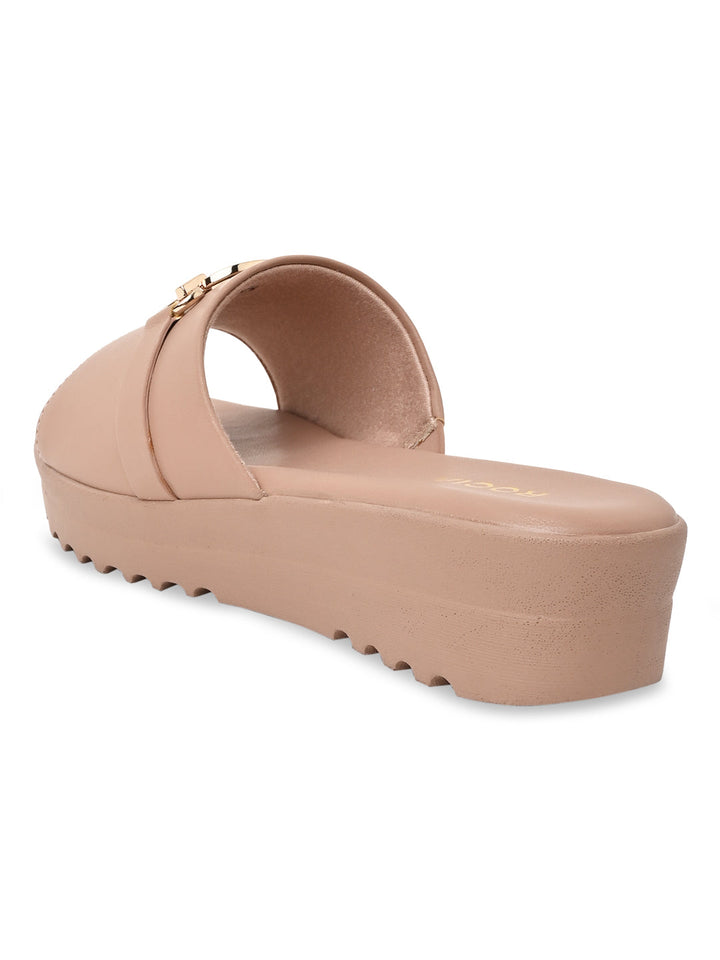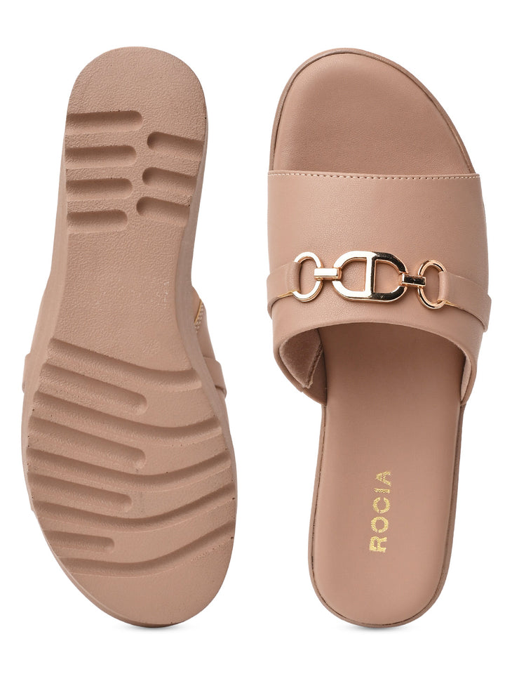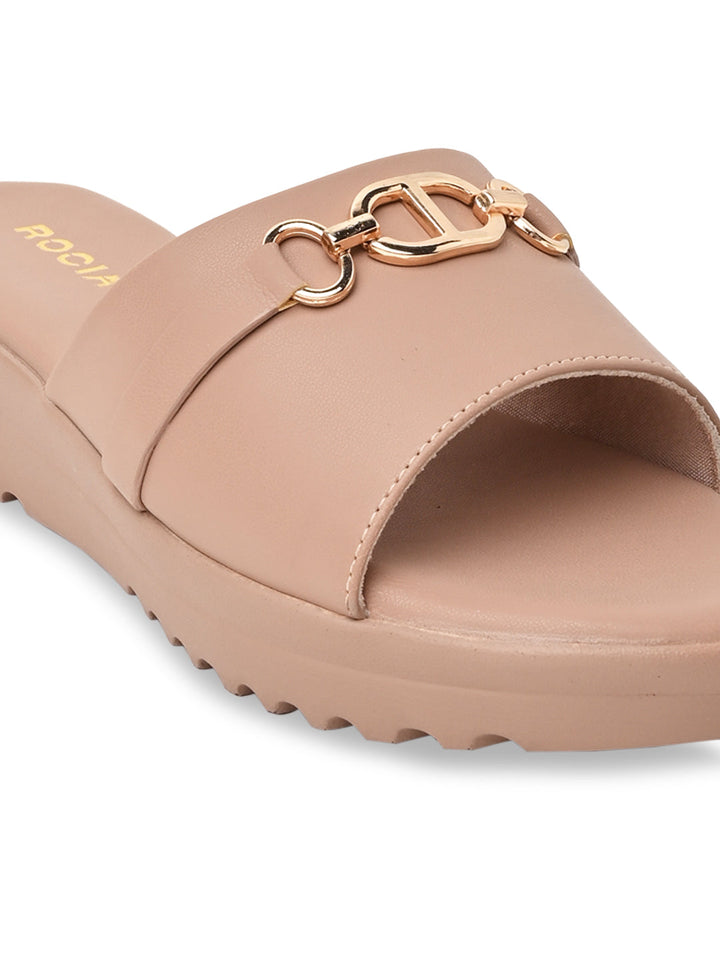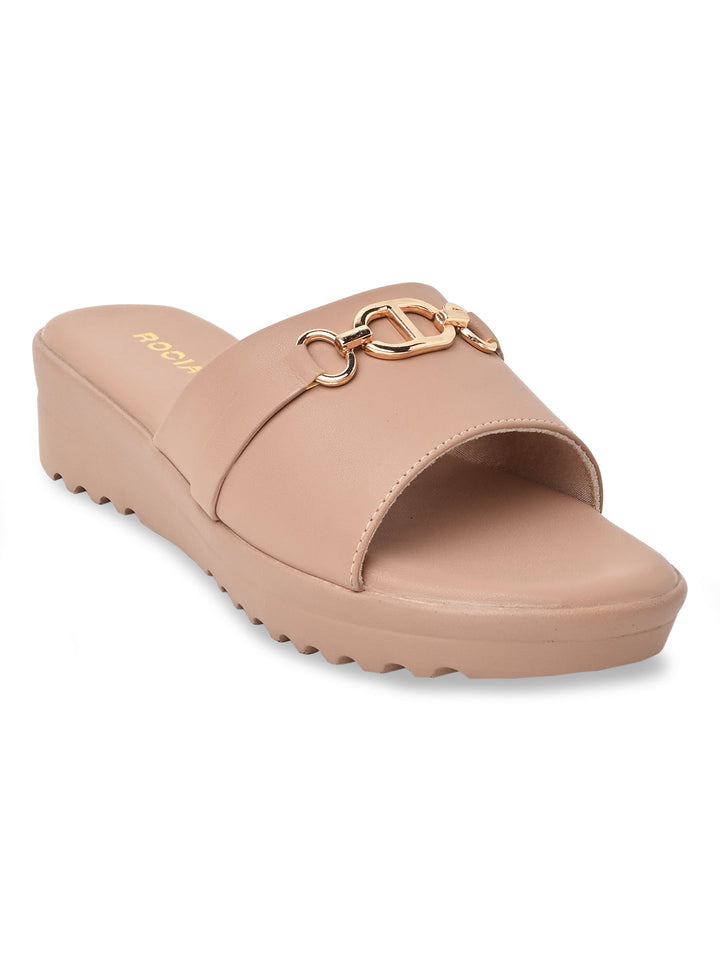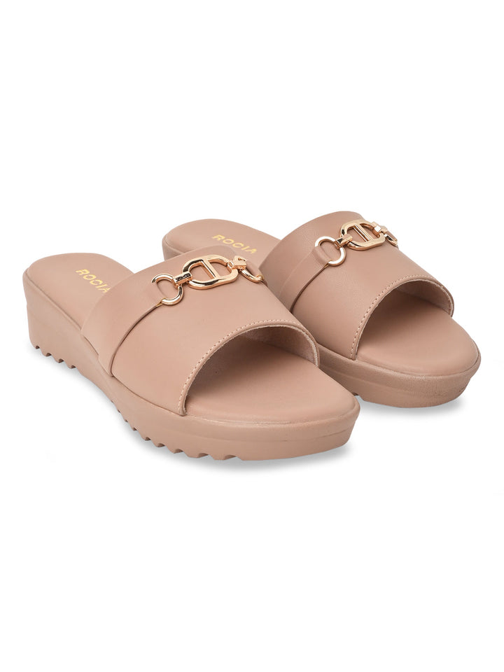 Step into classic comfort with Rocia by Regal Grey and Nude Women Buckled Classic Slip On Wedges. Synthetic uppers, PU soles, 2-inch wedge heels, and slip-on design with open round toes make them ideal for casual summer wear.