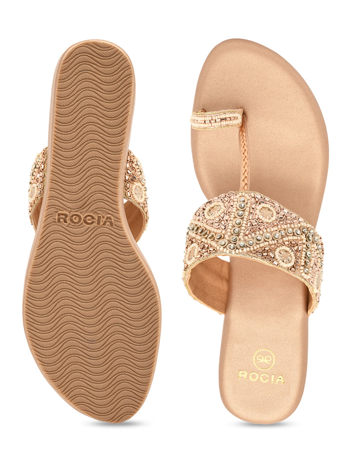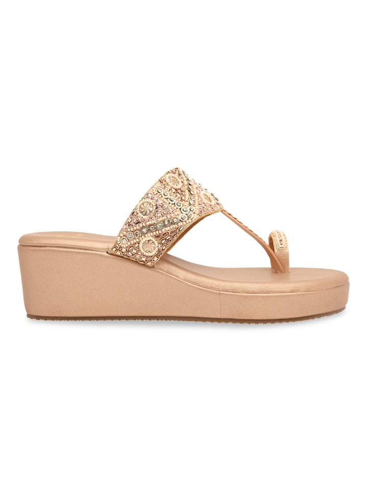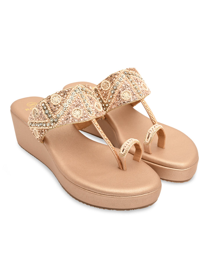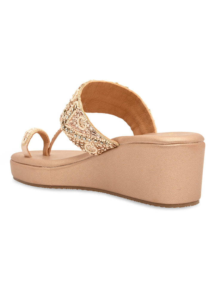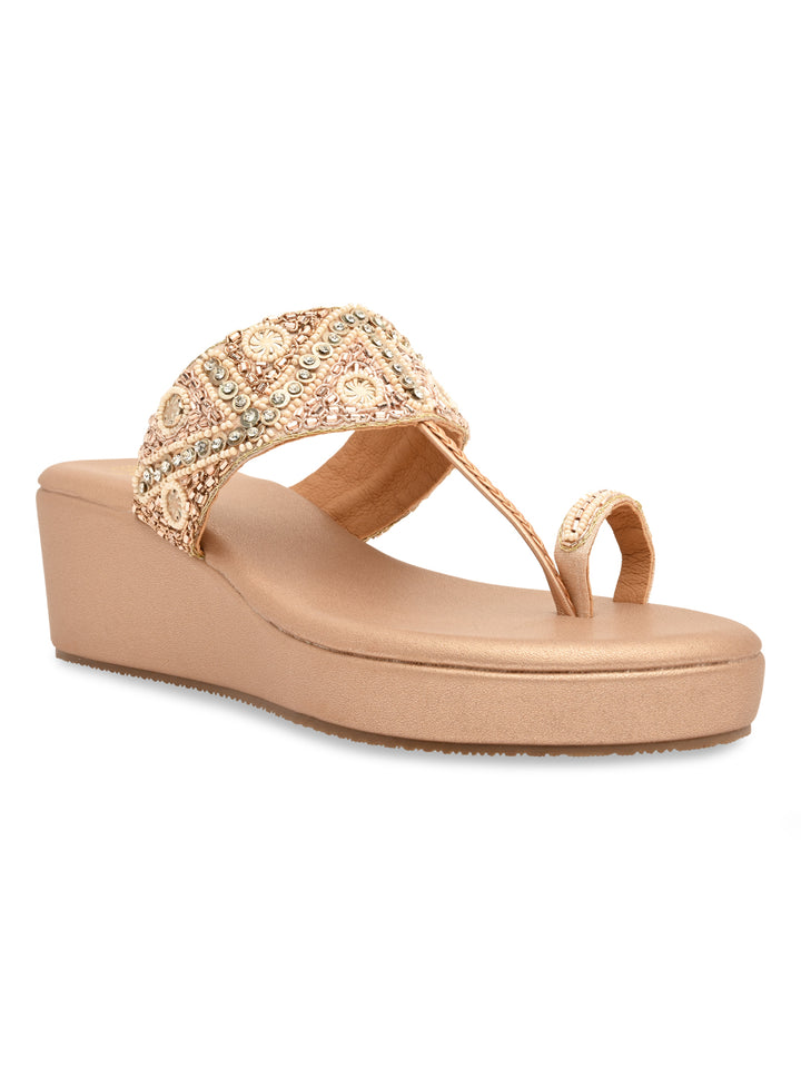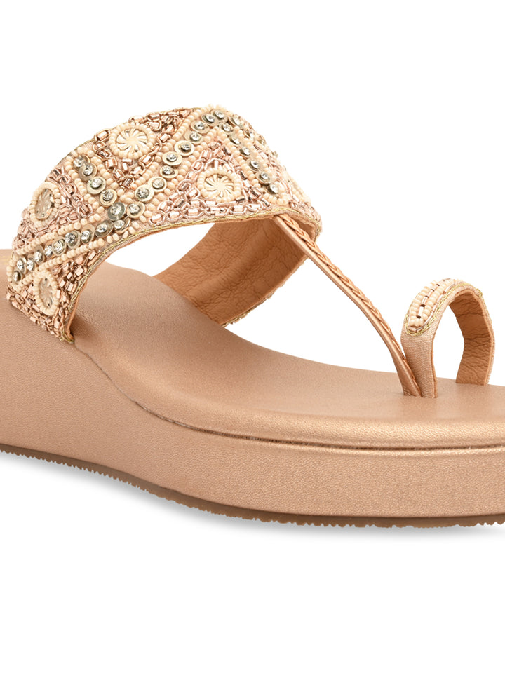 Rocia By Regal Rose Gold Women One Toe Embroidered Wedges